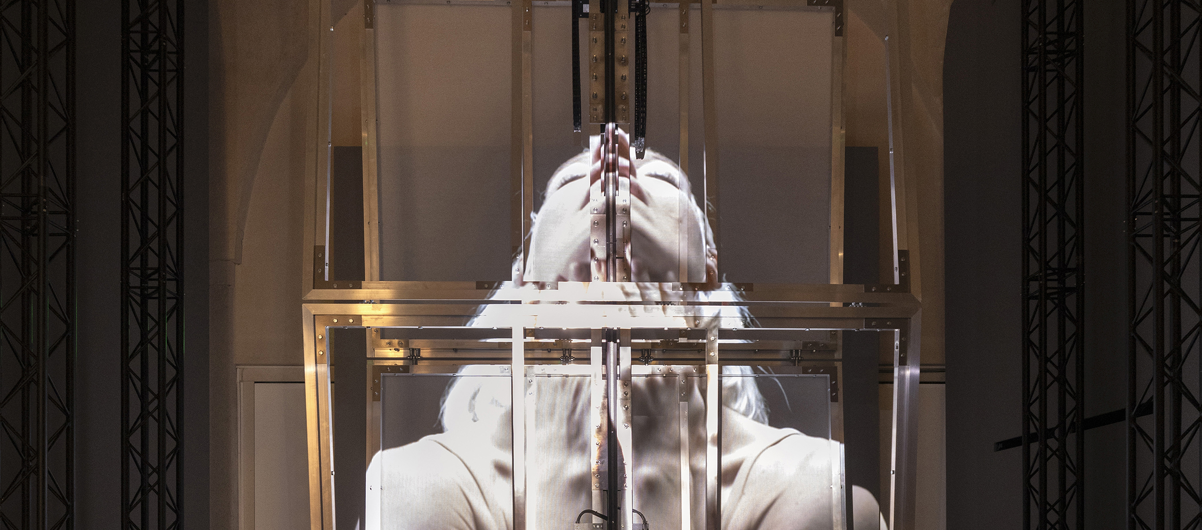 A Body for AI is a lone kinetic dancer or a technological fragment that has different types of live-action footage projected onto it — some motion capture, some AI, some digitally filmed; exploring different forms of image-making and processes of alteration. Sometimes the sculpture goes flat; sometimes it folds; sometimes it folds and rotates to move up and down. It has video coming in and out focus, an archive of imagery fading on and off the piece as it moves.