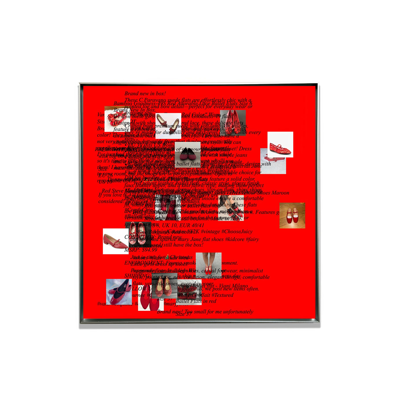 Maya Man’s (The Angels Wanna Wear My) Red Shoes, based on Hans Christian Andersen’s cautionary fairy tale The Red Shoes. will be presented as small prints on aluminum dibond. Each print freezes a moment from Man’s algorithm — which scrapes user-generated posts from Depop, the online vintage clothes marketplace— and turns them into compositions. They capture, according to a gallery catalogue entry, “the chaotic interplay of automated desire, digital aesthetics, and secondhand consumer culture”.